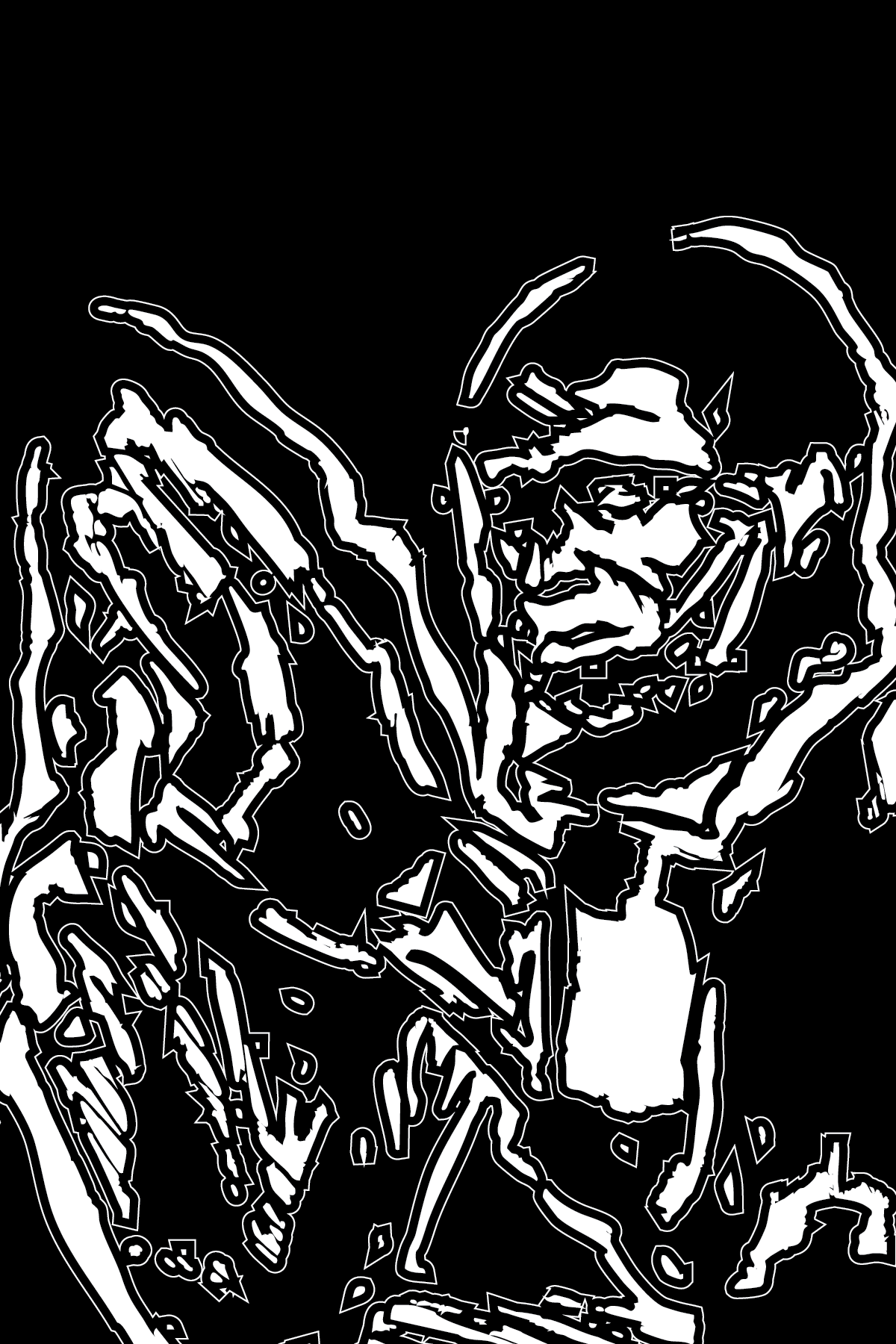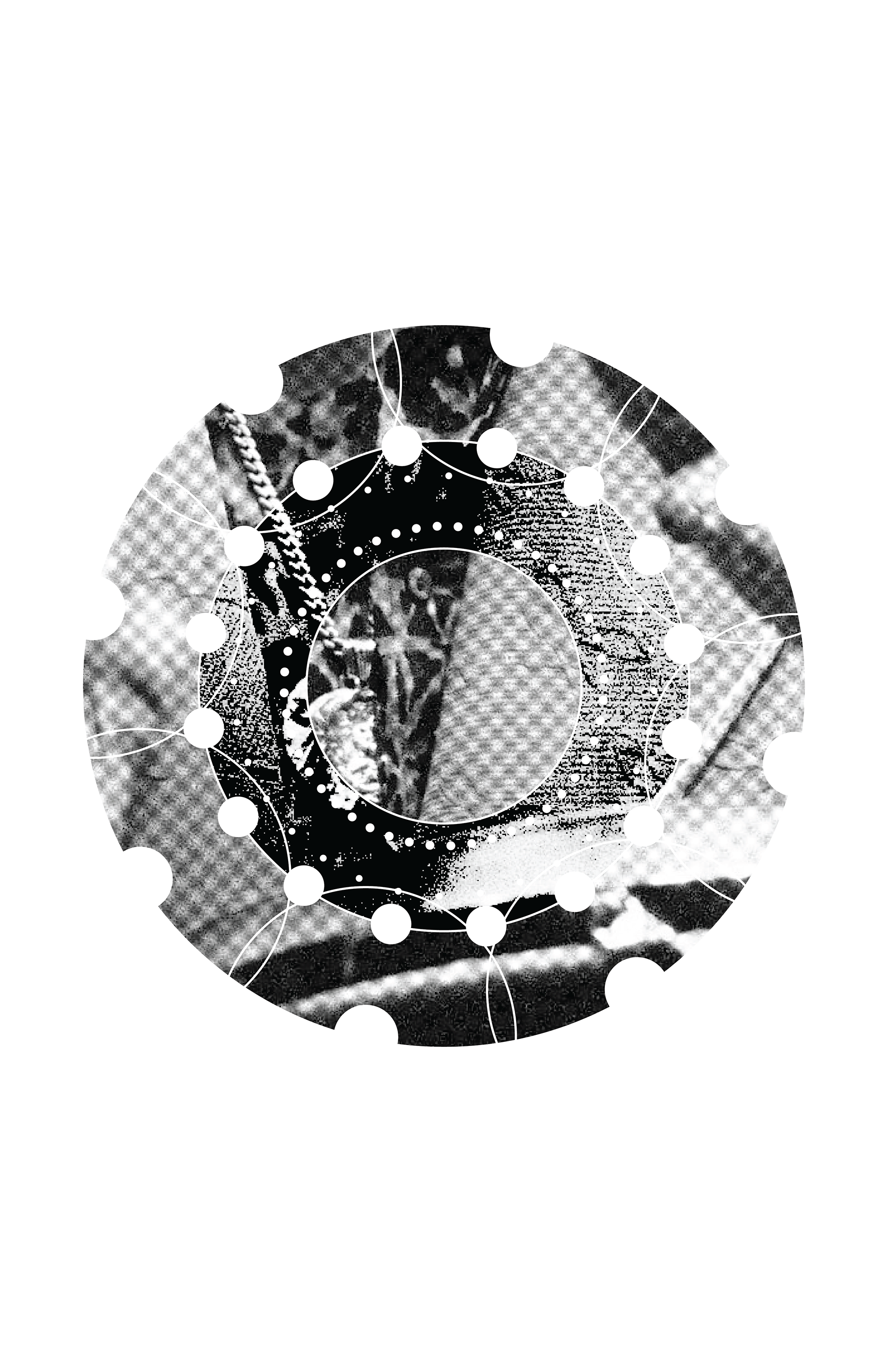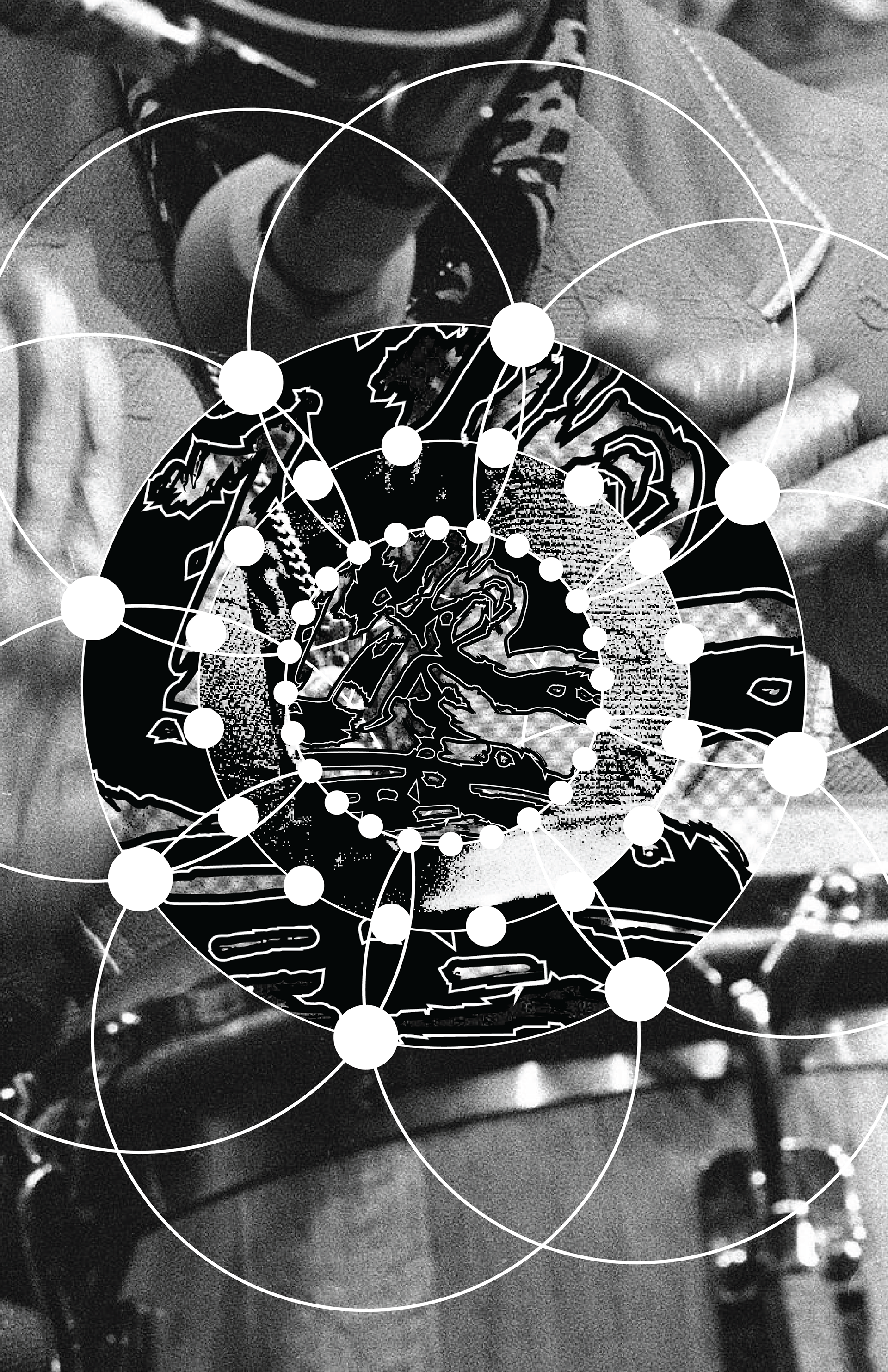 "Hands of Memory" translates the rhythmic architecture of Mongo Santamaría's "Afro Blue" into visual form. Inspired by his "Afro Roots" album cover, the design explores themes of transculturation and cultural survival through geometric abstraction. Repeating white nodes create visual ostinato, echoing the composition's foundation.