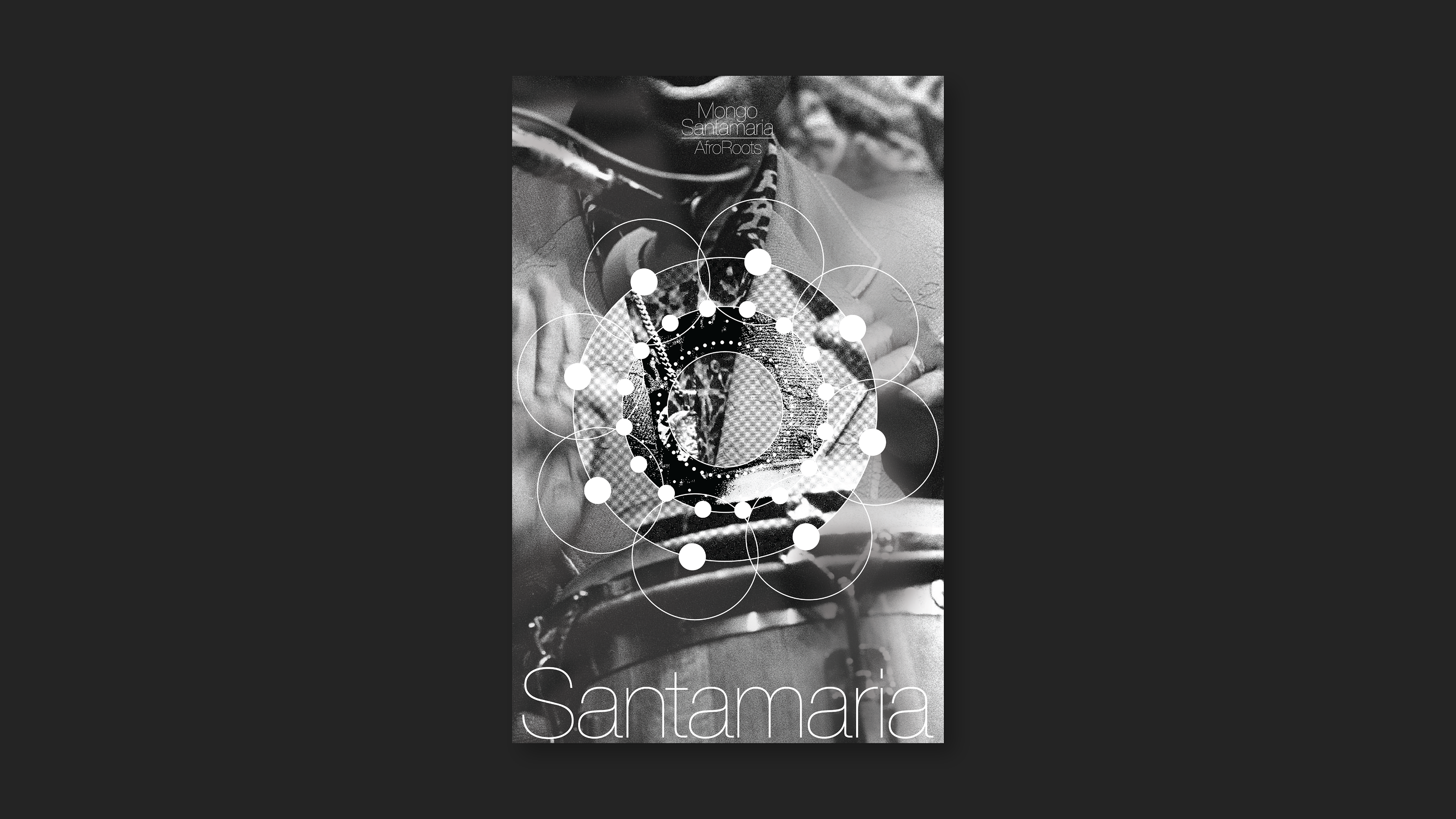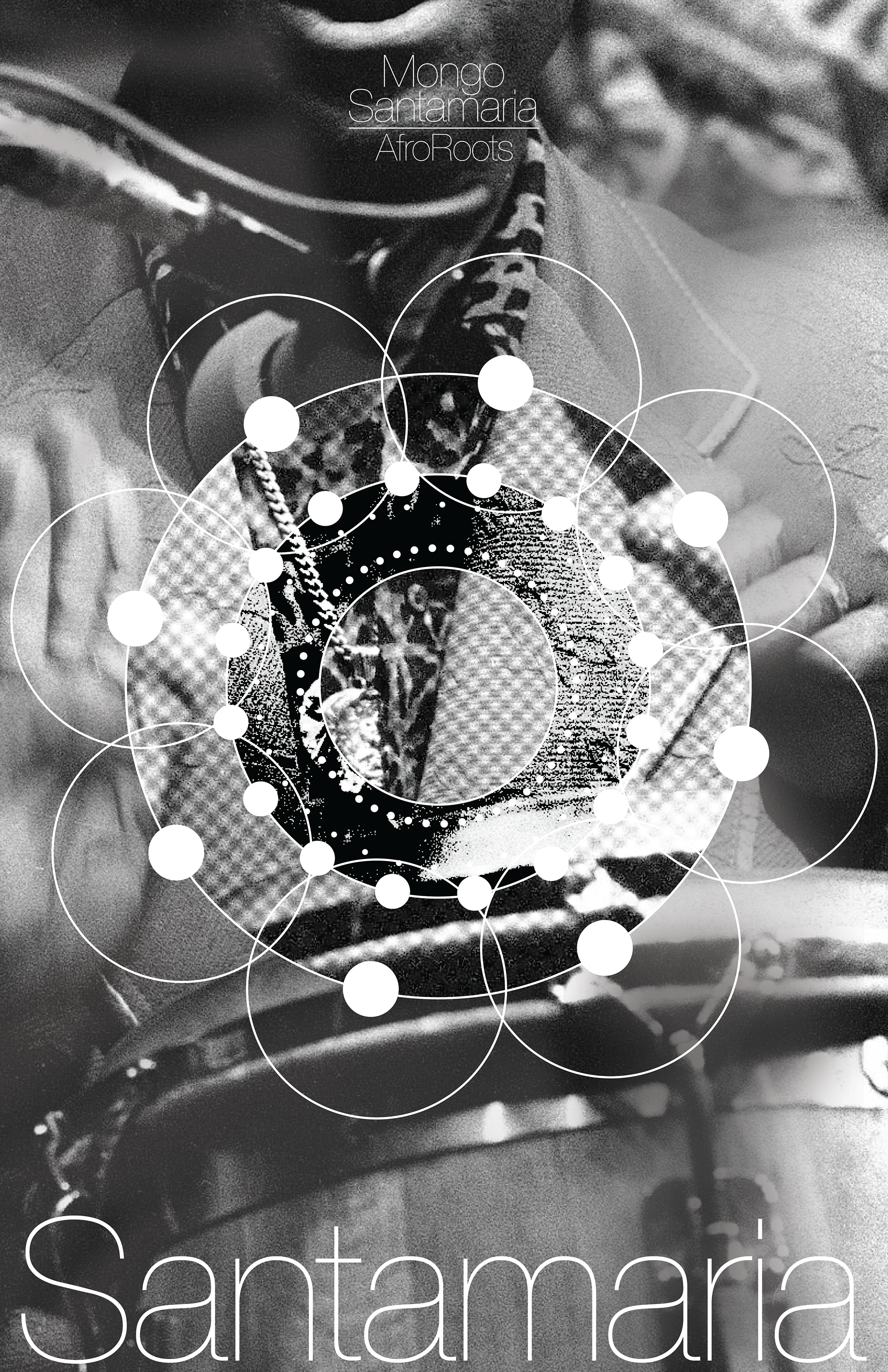 Three concentric rings of varying-sized circles generate visual polyrhythms, converging at precise moments to mirror the tension and release of interlocking percussion patterns. At the center, a photograph of Mongo's blurred hands on a tilted conga drum anchors the composition, emphasizing how sacred Yoruba rhythms survived the Middle Passage through embodied practice rather than written notation.